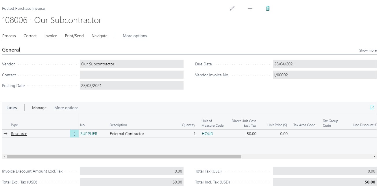 The subcontractor issued the invoice only for two hours but later he realized the mistake and sent another invoice for an additional 1 hour. The accountant was able to register the next hour for the same expense – he could put the line manually but also function used previously will get for him the expense lines. After posting the expense lines in the work order ledger entries will have correct values.